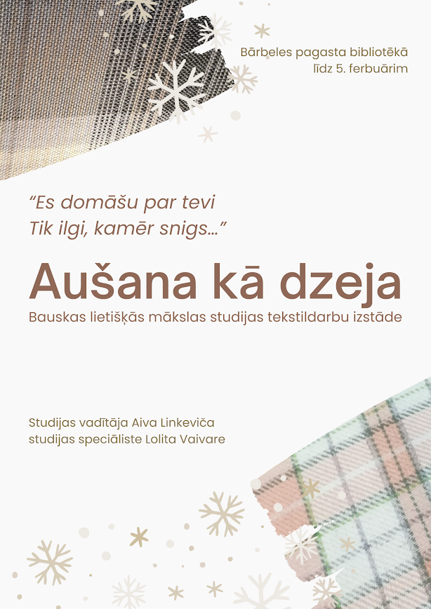 Līdz 2026. gada 5. februārim Bārbeles pagasta bibliotēkā skatāma Bauskas lietišķās mākslas studijas tekstildarbu izstāde "Aušana kā dzeja". Izstādē skatāmi 30 darbi - vilnas lakati, mohēras šalles un lakati.