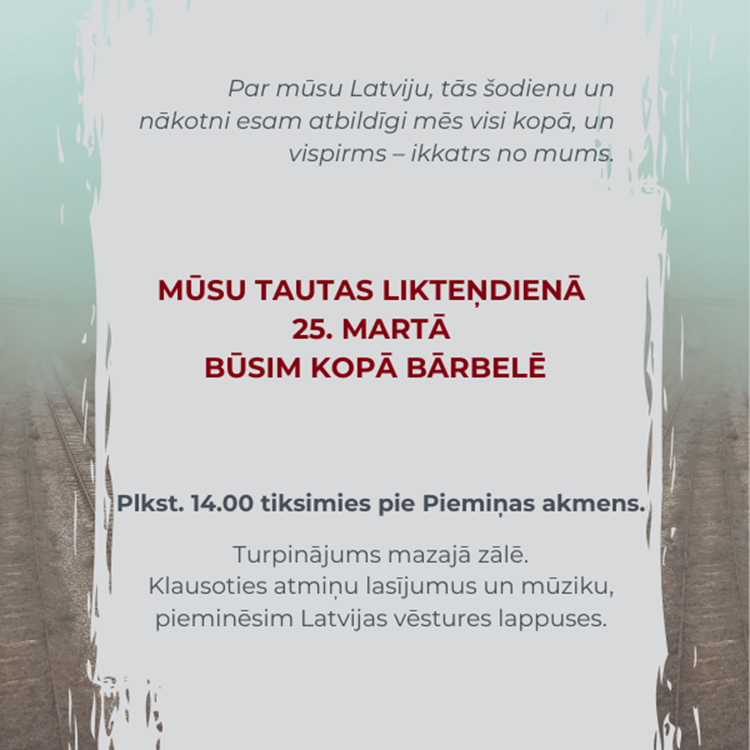 Plkst. 14.00 tiksimies pie Piemiņas akmens. Turpinājums mazajā zālē. Klausoties atmiņu lasījumus un mūziku, pieminēsim Latvijas vēstures lappuses.