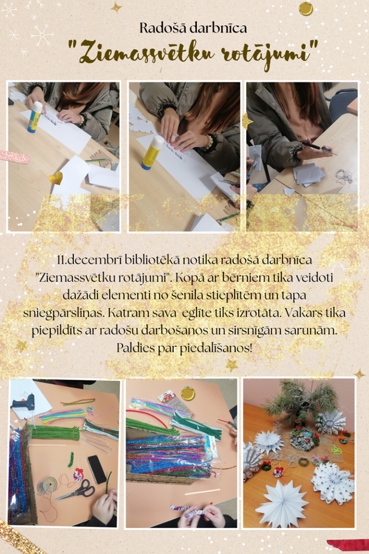 2025. gada 11. decembrī Dāviņu pagasta bibliotēkā notika radošā darbnīca bērniem "Ziemassvētku rotājumi". Kopā ar bērniem tika meklētas dažādas idejas dekoriem gan bibliotēkas krājumā, gan interneta dzīlēs. Tika veidoti dažādi elementi no šenila stieplītēm, katram sava eglīte tiks izrotāta. Tapa arī sniegpārsliņas, kuras rotās bibliotēkas telpas. Vakars tika piepildīts ar radošu darbošanos un sirsnīgām sarunām.