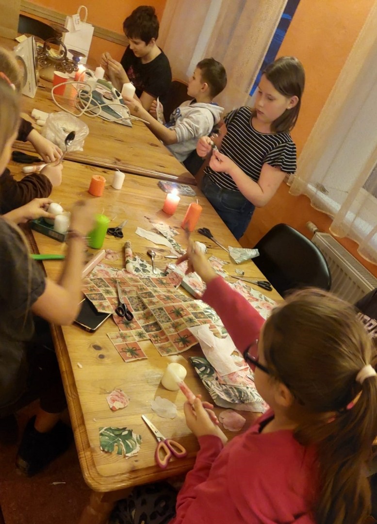 Pasākuma otrajā daļā ikvienam bija iespēja darboties radošajā darbnīcā "Svečošanās", kurā tika dekupētas sveces ar salvetēm. Visi atnākušie cītīgi darbojās un bija liela interese par to kā notiek process. No izdekorētajām svecēm tika izveidota izstāde, kura februāra mēnesī būs aplūkojama Dāviņu bibliotēkā.