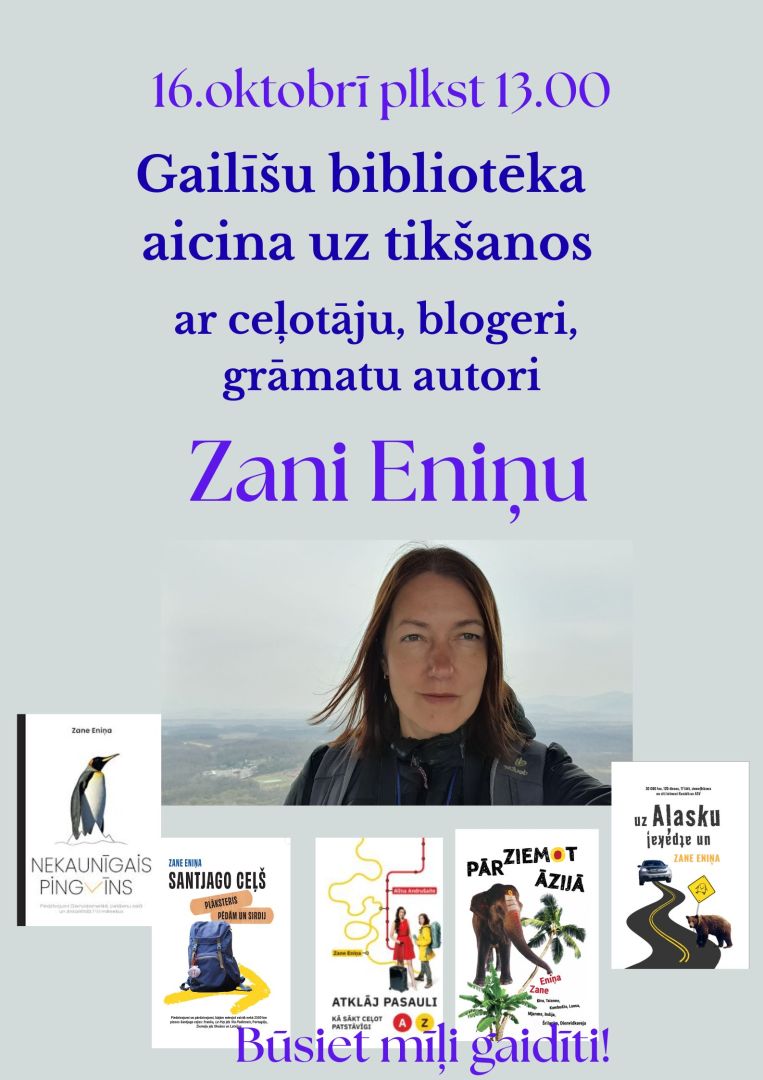 2025.gada 16.oktobrī plkst.13.00 Gailīšu bibliotēka aicina uz tikšanos ar ceļotāju un vairāku grāmatu autori Zani Eniņu. Pavadi laiku aizrautīgā ceļojumā un sirsnīgās sarunās.