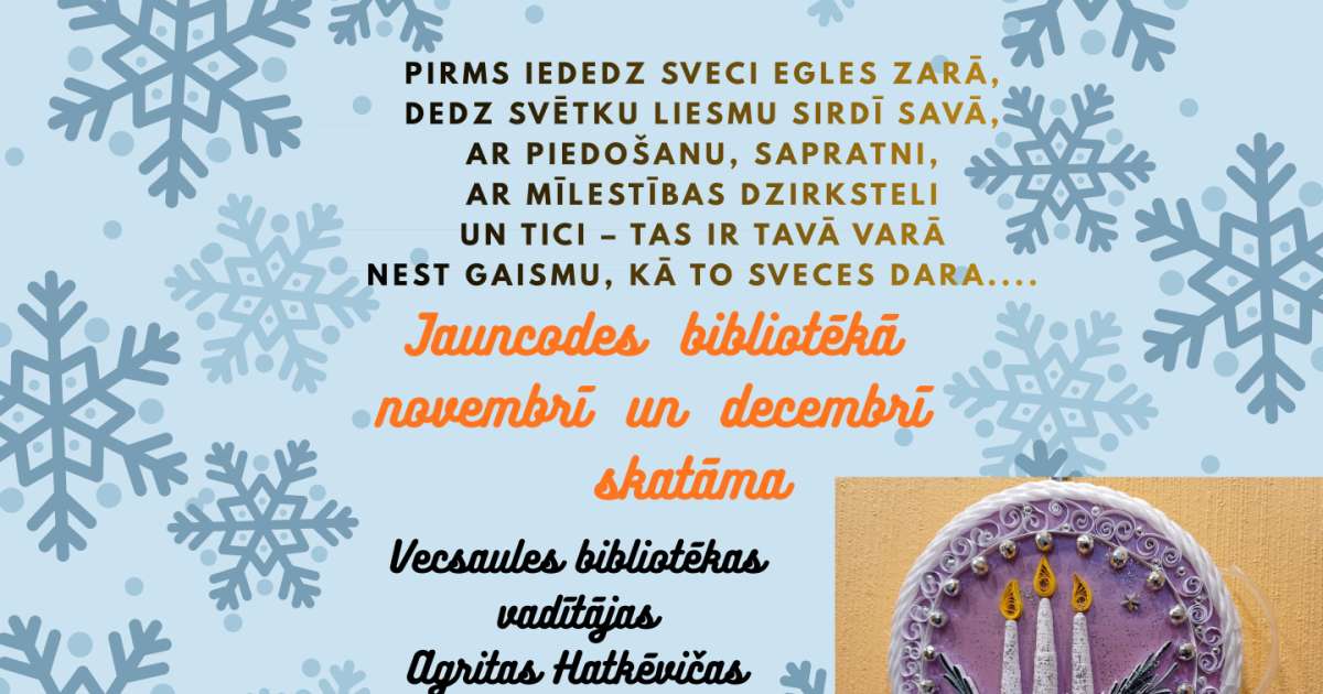 2025. gada novembrī un decembrī Jauncodes bibliotēkā skatāmi Vecsaules pagasta Vecsaules bibliotēkas vadītājas Agritas Hatkēvičas 12 darinātie darbiņi kvilinga tehnikā.