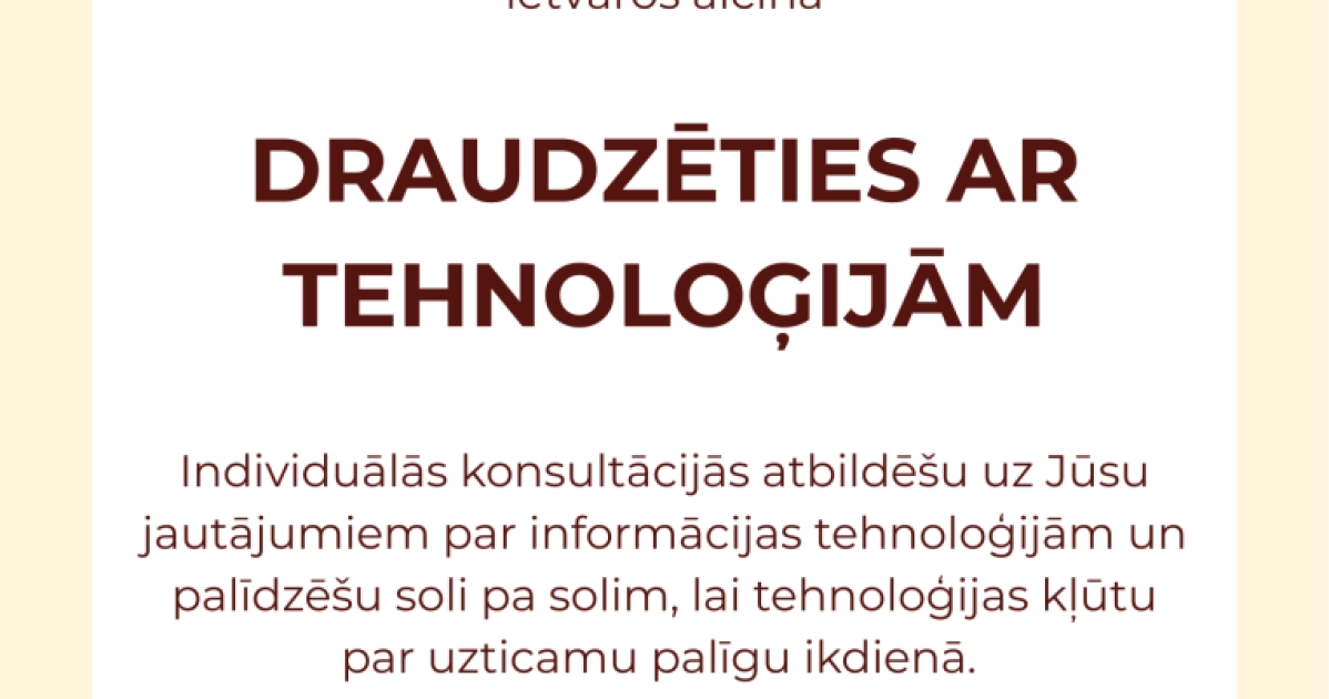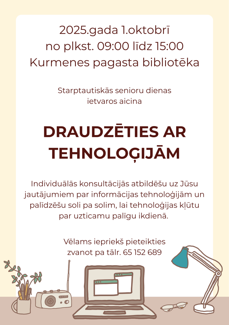 2025. gada 1. oktobrī no plkst. 9.00 līdz plkst. 15.00 Kurmenes pagasta bibliotēka Starptautiskās senioru dienas ietvaros aicina "Draudzēties ar tehnoloģijām".