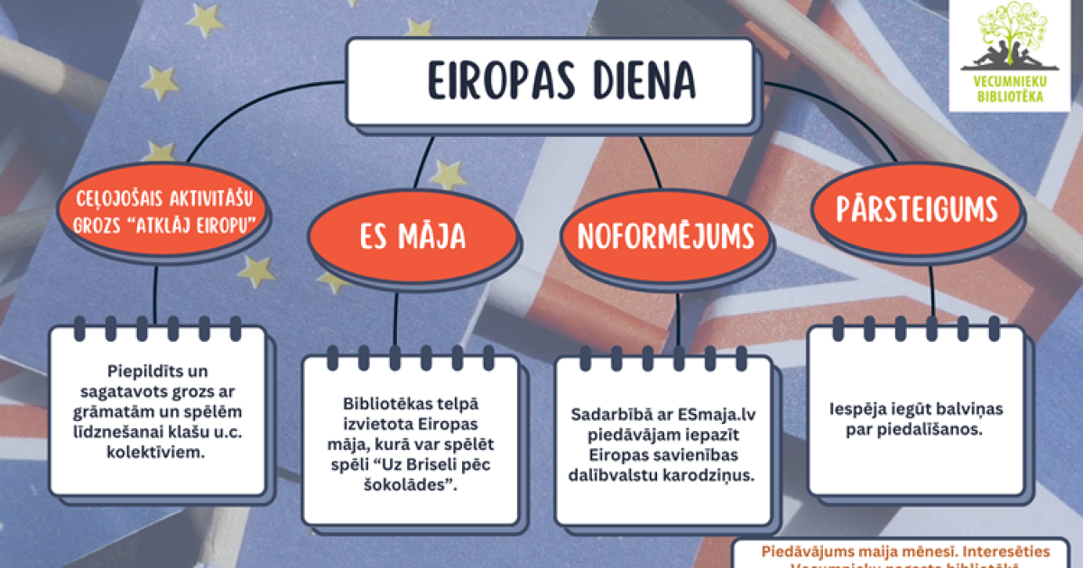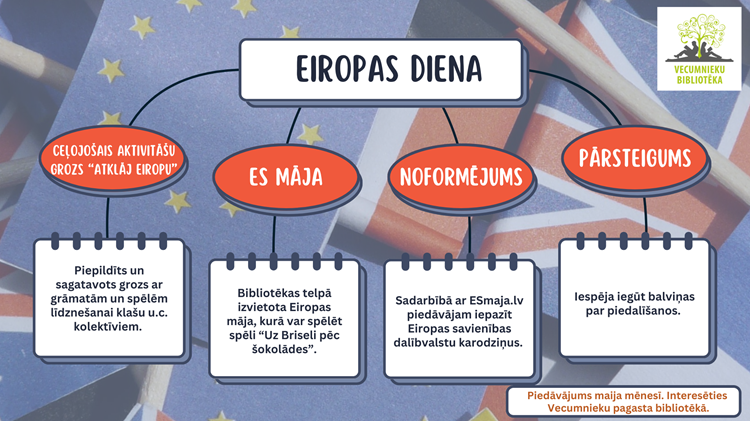No 2025. gada 9. maija – 16. maijam Vecumnieku pagasta bibliotēkā iespējamas dažādas aktivitātes Eiropas dienas ietvaros.