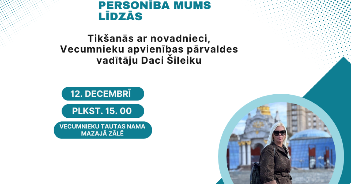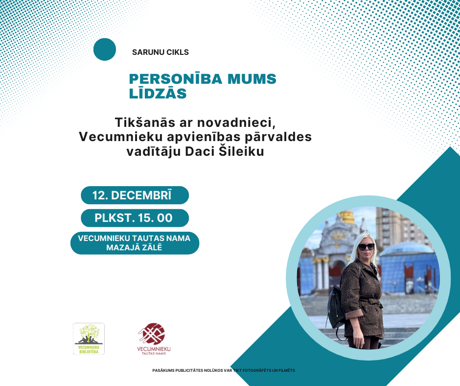 2025. gada 12. decembrī plkst. 15. 00 Vecumnieku pagasta bibliotēka aicina uz 6. sarunu ciklā "Personība mums līdzās", lai tiktos ar novadnieci, Vecumnieku apvienības pārvaldes vadītāju Daci Šileiku.