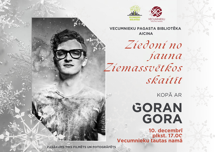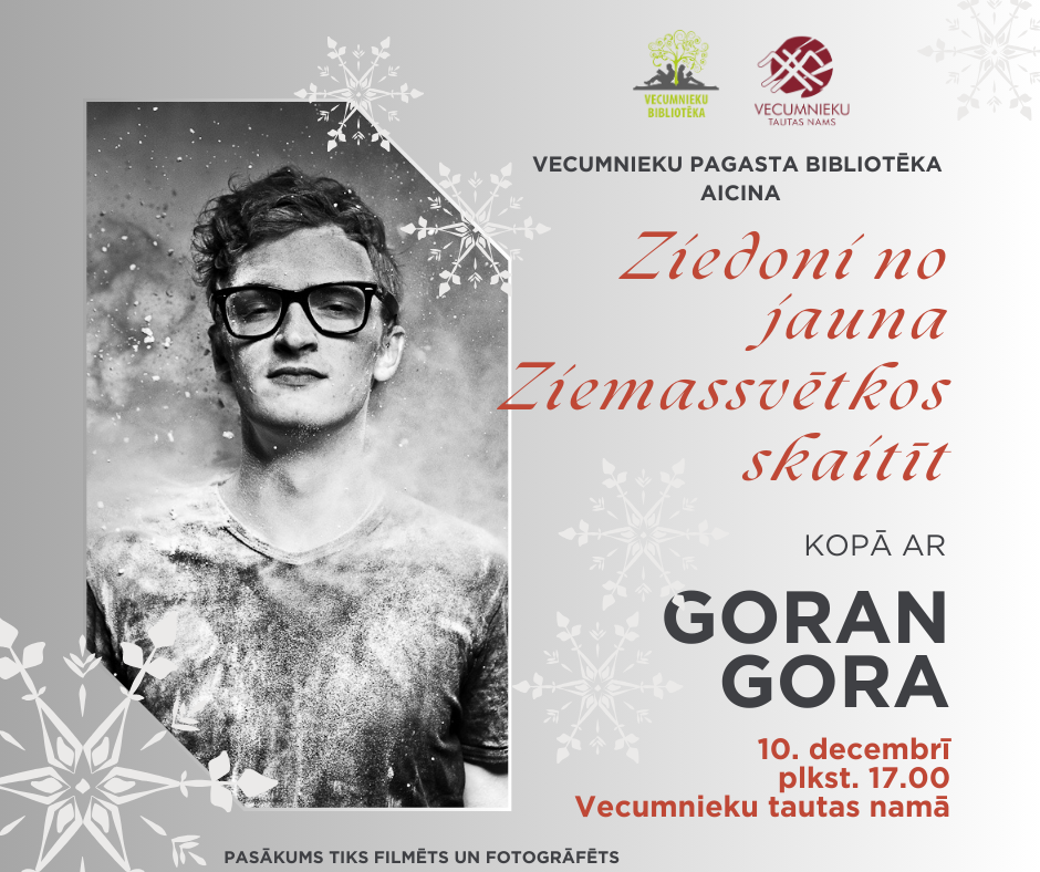 2025. gada 10. decembrī plkst. 17. 00 Vecumnieku pagasta bibliotēka aicina uz muzikāli literāru Ziemassvētku ieskaņas sarunu kopā ar dziesminieku Goran Gora jeb Jāni Upmani - Holšteinu.