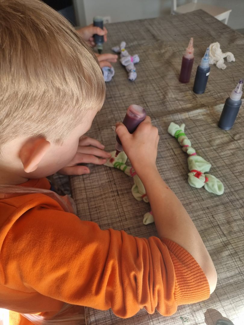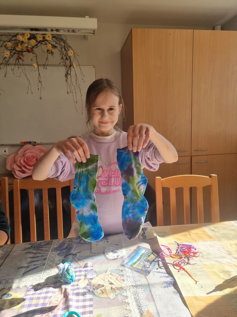Krāsainu zeķu batikošanas nodarbība bērniem