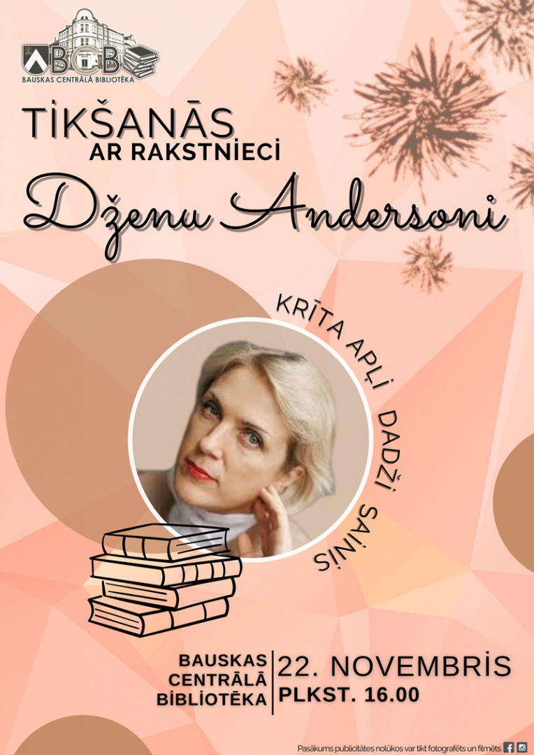 2024. gada 22. novembrī plkst. 16.00 būsiet laipni gaidīti Bauskas Centrālajā bibliotēkā, lai tiktos ar rakstnieci Dženu Andersoni.