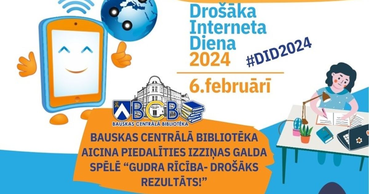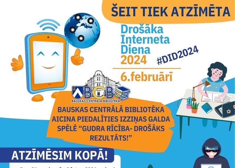 Bauskas Centrālā bibliotēka aicina savus apmeklētājus 6. februārī piedalīties izziņas galda spēlē "Gudra rīcībā – drošāks rezultāts!" Šī spēle, ko izstrādājuši www.drossinternets.lv speciālisti, mudina mācīties un atkārtot zināšanas par drošu paroļu veidošanu un izmantošanu, kā arī aicina ikvienu domāt par to, kā mēs katrs rūpējamies par savu drošību internetā.
