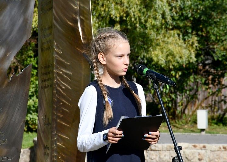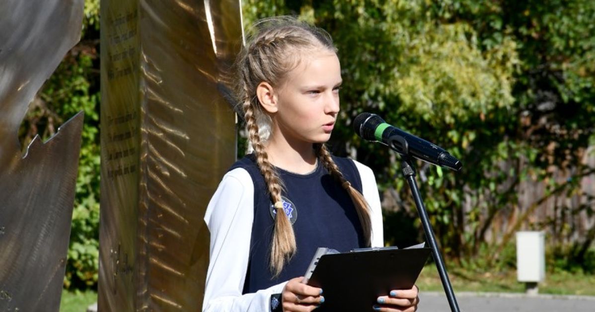 Dzejdarbus pie mikrofona lasa skolniece Lēra Oboleviča un Sandra Cīrule ar kopkori.