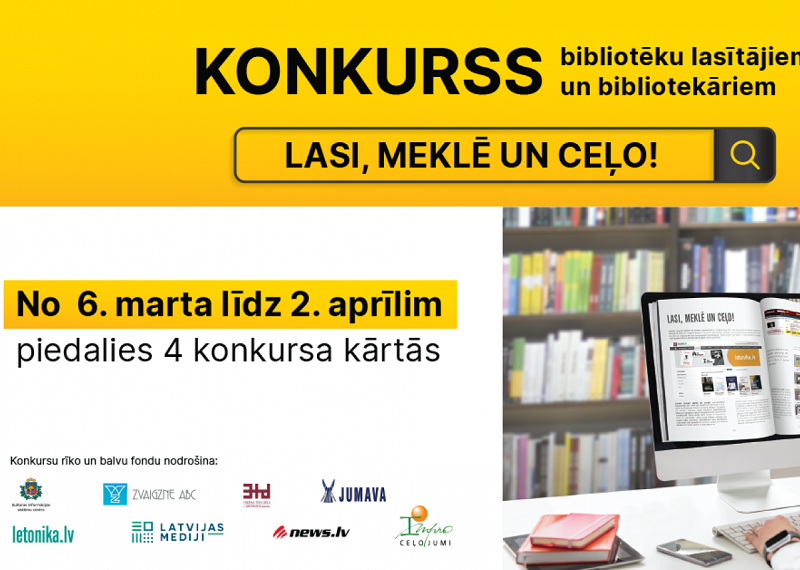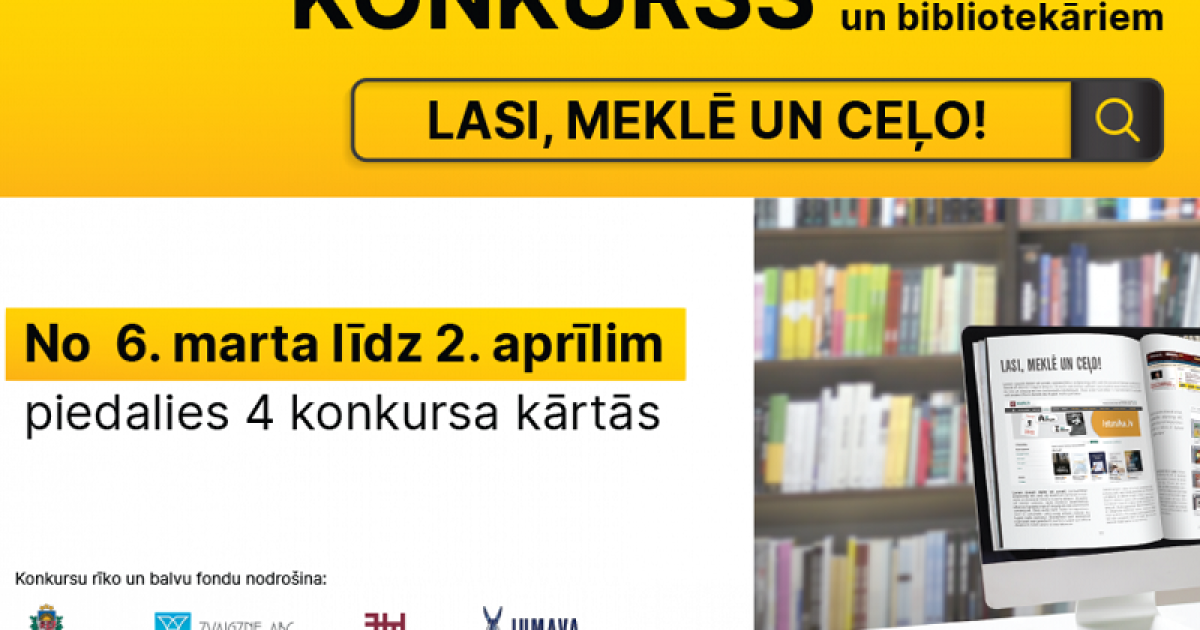 Aicinām no šī gada 6. marta līdz 2. aprīlim Latvijas bibliotēku lasītājus un bibliotekārus piedalīties izzinoši izglītojošā konkursā "Lasi, meklē un ceļo!" un meklēt atbildes e-resursos, kuri pieejami vienotajā bibliotēku tīklā, - 3td e-GRĀMATU bibliotēkā 3td.lv, digitālo zinību resursā letonika.lv un Lursoft laikrakstu lasītavā news.lv. Pasākumu rīko Kultūras informācijas sistēmu centrs sadarbībā ar 3td bibliotēkā iesaistītajām izdevniecībām – "Zvaigzne ABC", "Latvijas Mediji" un "Jumava" – un IT uzņēmumiem "Tilde" un "Lursoft IT". Konkursu atbalsta ceļojumu aģentūra “IMPRO”.