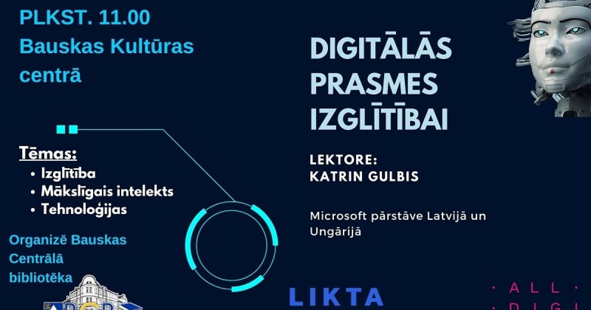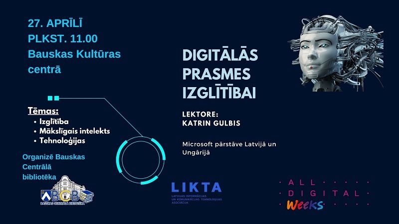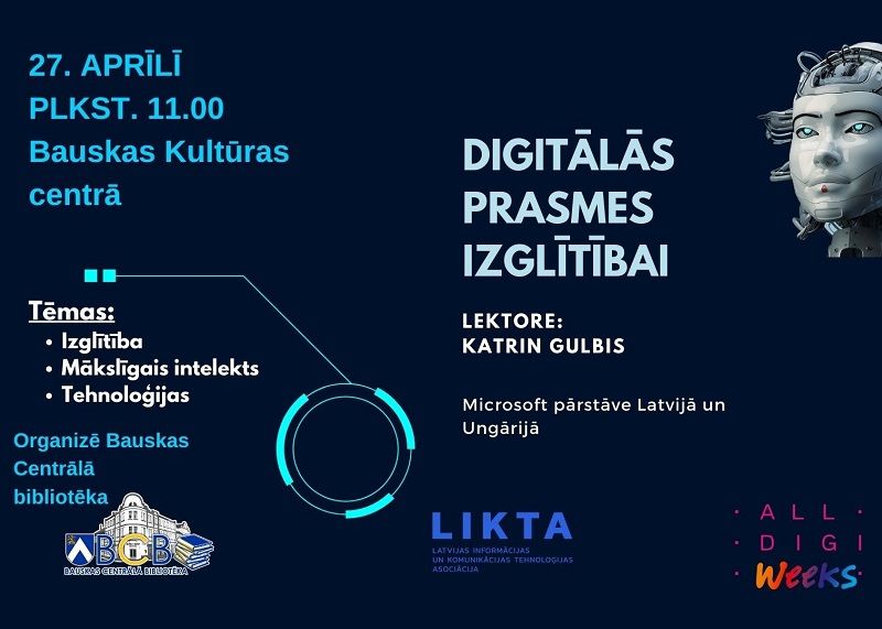 Digitālās nedēļas ietvaros Bauskas Centrālā bibliotēka aicina ikvienu interesentu piedalīties seminārā "Digitālās prasmes izglītībai", kas norisināsies 27. aprīlī plkst. 11.00 Bauskas Kultūras centra Izstāžu zālē.
