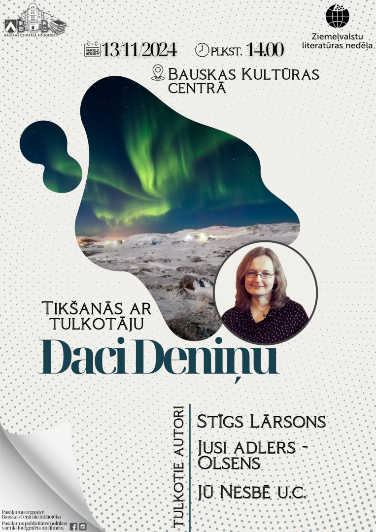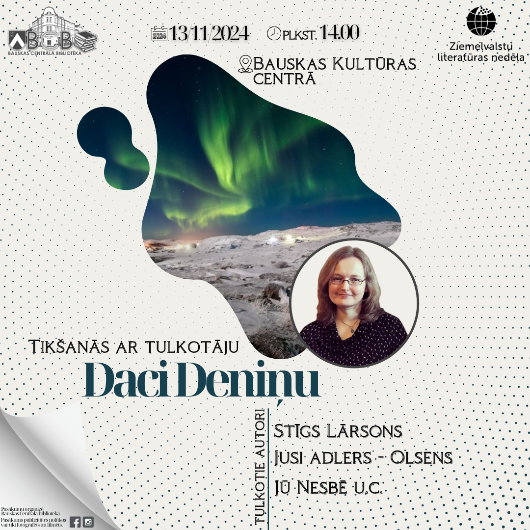 2024. gada 13. novembrī plkst. 14.00 Ziemeļvalstu literatūras nedēļas ietvaros Bauskas Centrālā bibliotēka aicina uz tikšanos ar tulkotāju Daci Deniņu.