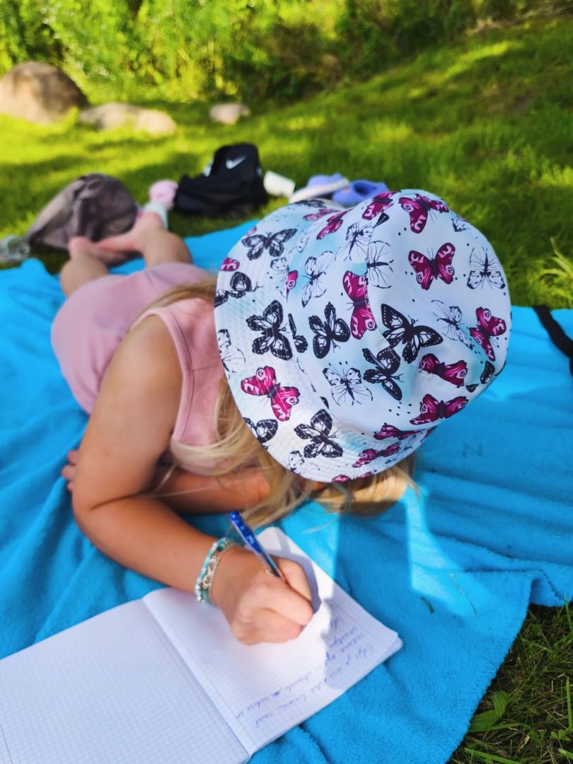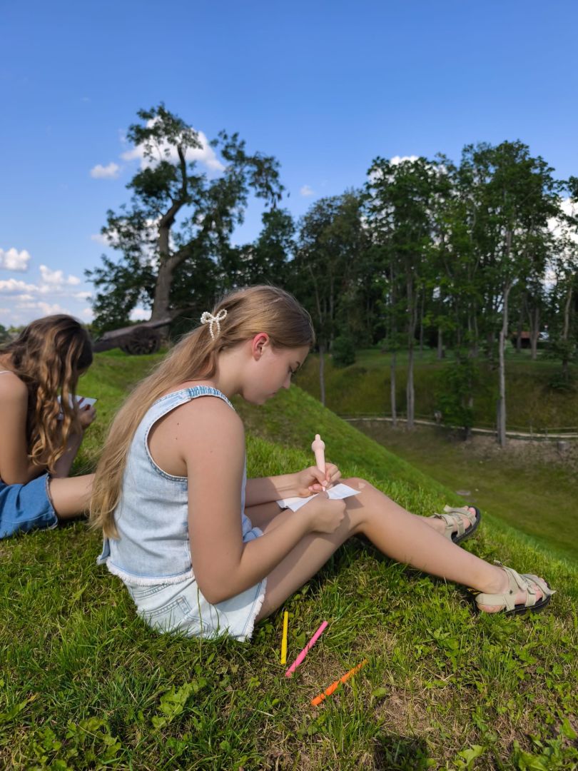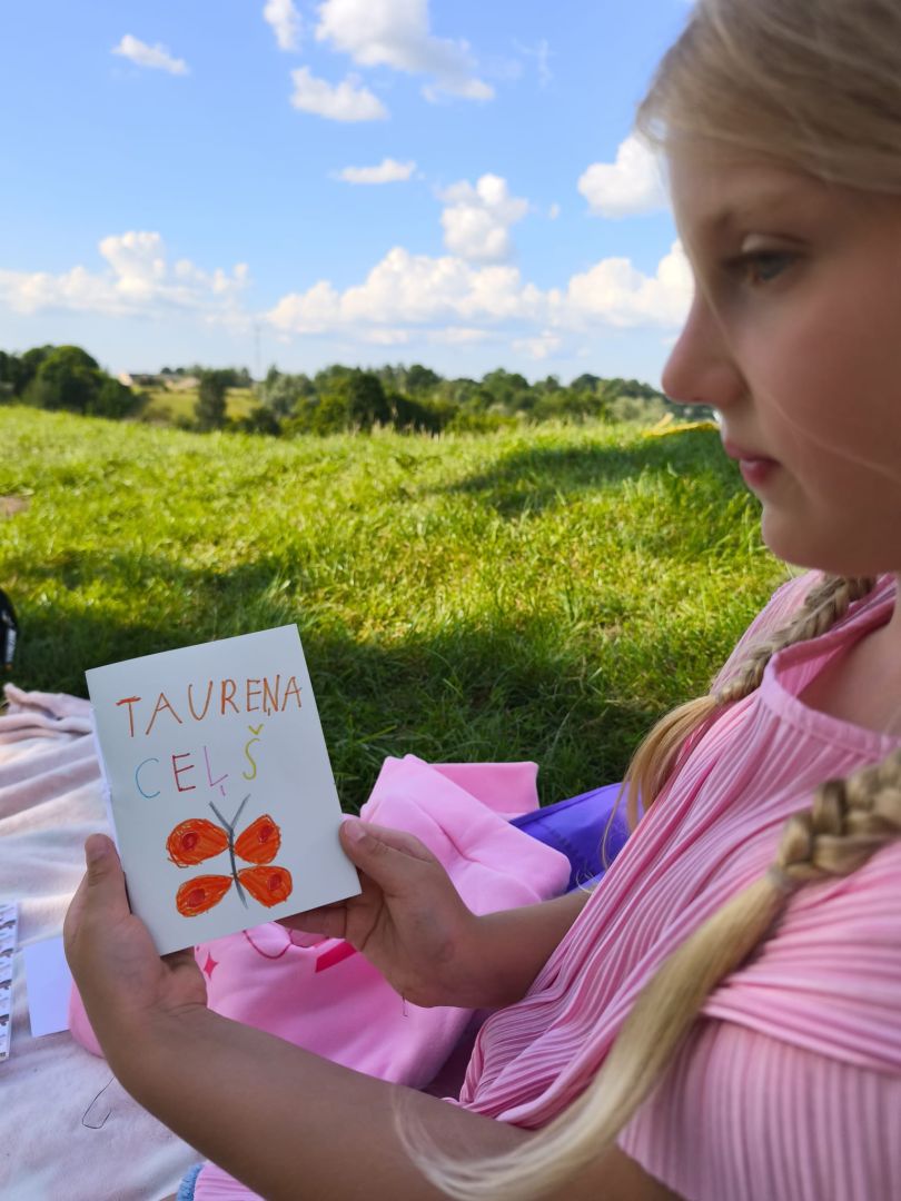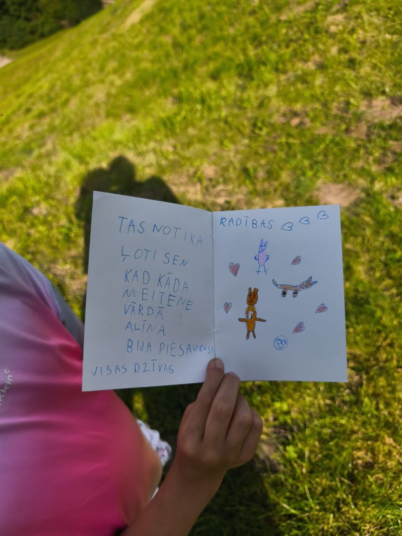 Otrā tikšanās notika īpašā vietā - tur, kur Mūsa un Mēmele satiekas.  Ar Monikas Vaicenavičienes grāmatas “Kas ir upe?” palīdzību tika iepazīti stāsti, kas slēpjas ūdens plūdumā, dabas balsīs un pat klusumā. Bērni mācījās ieklausīties dabā un paši sevī, pierakstot savas domas un sajūtas, kuras vēlāk pārvērta stāstos.