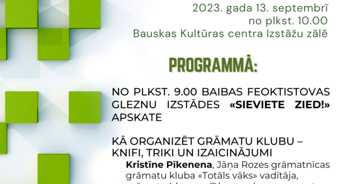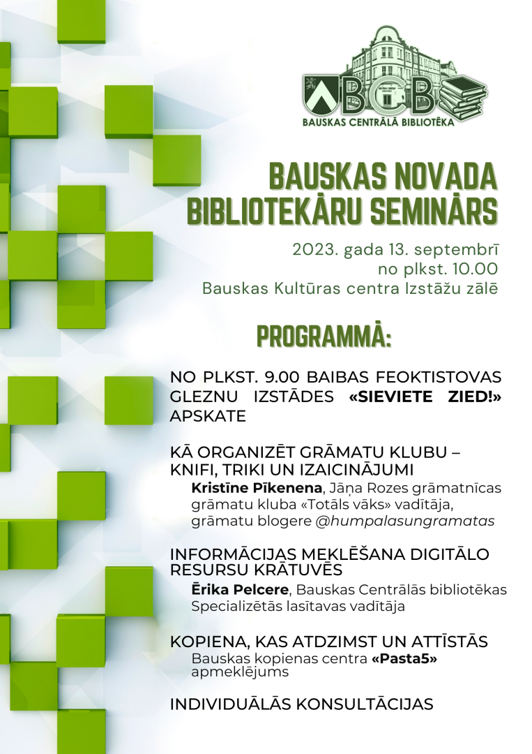 Bauskas Centrālā bibliotēka organizē Bauskas novada bibliotekāru semināru, kas norisināsies 2023. gada 13. septembrī no plkst. 10.00 Bauskas Kultūras centra Izstāžu zālē.