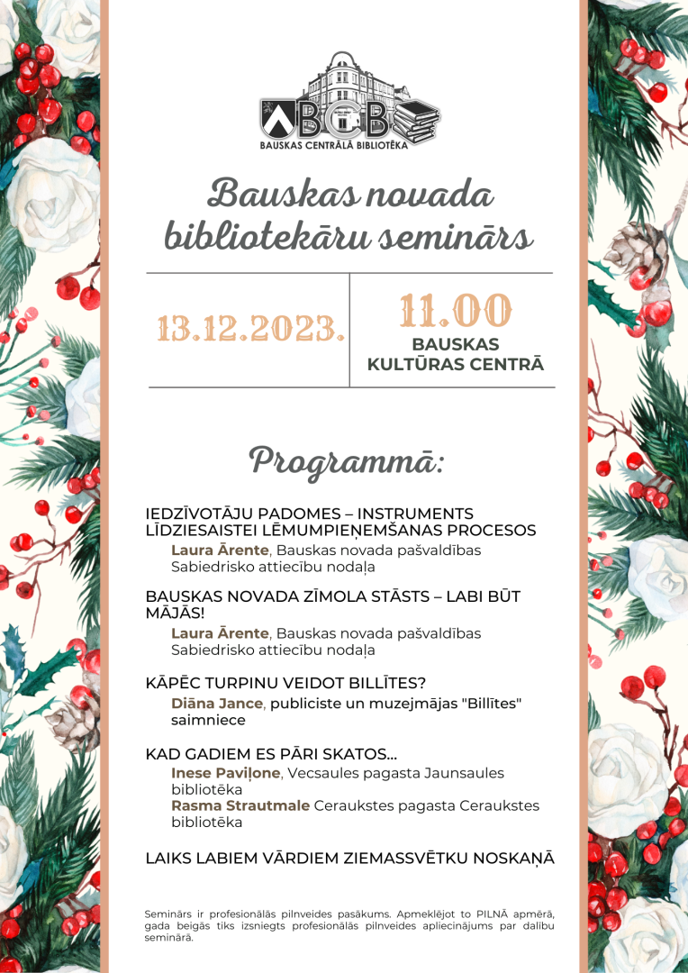 Bauskas Centrālā bibliotēka organizē Bauskas novada bibliotekāru semināru, kas norisināsies 2023. gada 13. decembrī no plkst. 11.00 Bauskas Kultūras centra Lielajā zālē.