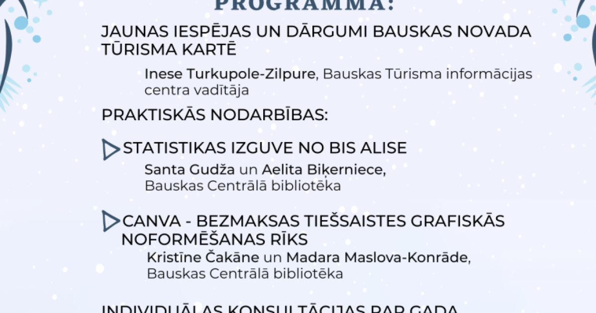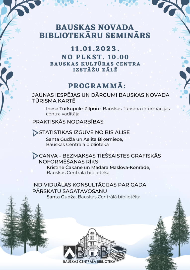Bauskas Centrālā bibliotēka organizē Bauskas novada bibliotekāru semināru, kas norisināsies 2023. gada 11. janvārī no plkst. 10.00 Bauskas Kultūras centra Izstāžu zālē.