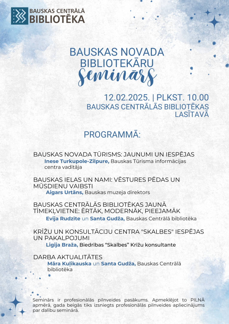 Bauskas Centrālā bibliotēka organizē Bauskas novada bibliotekāru semināru, kas norisināsies 2025. gada 12. februārī Bauskas Centrālās bibliotēkas lasītavā.