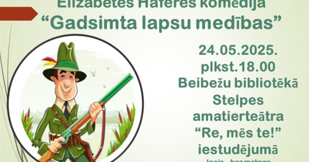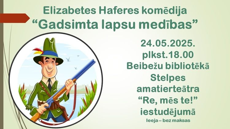 2025. gada 24. maijā plkst. 18.00 Beibežu bibliotēkā būs skatāma Elizabetes Haferes komēdija "Gadsimta lapsu medības" Stelpes amatierteātra "Re, mēs te!" iestudējumā.