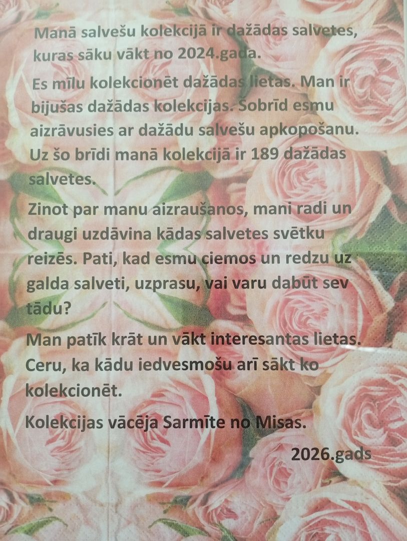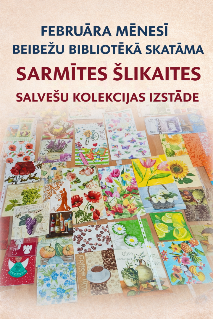 2026. gada februāra mēnesī Beibežu bibliotēkā skatāma Sarmītes Šlikaites salvešu kolekcijas izstāde. Atnāciet, būsiet pārsteigti, cik krāšņas un interesantas var būt salvetes!
