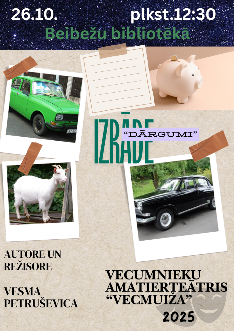 2025. gada 26. oktobrī plkst. 12.30 Beibežu bibliotēka aicina uz Vecumnieku amatierteātra "Vecmuiža" izrādi "Dārgumi".
