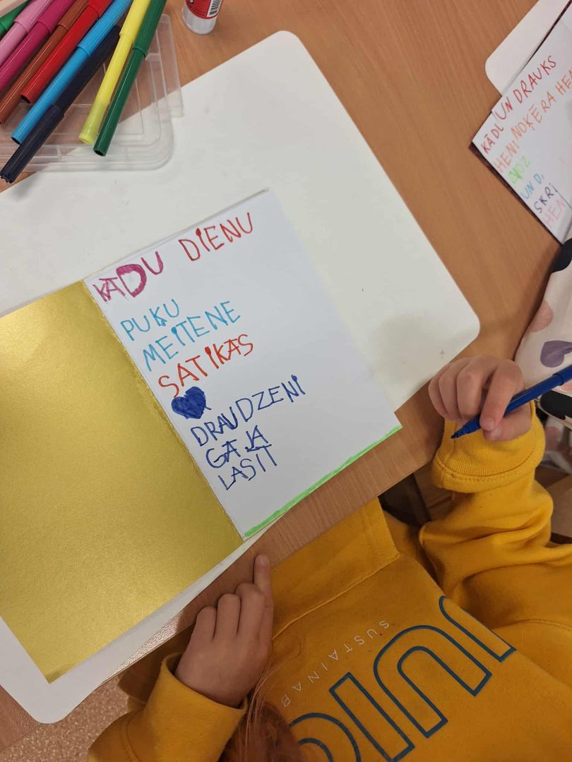 Kopīgi lasījām I. Zanderes grāmatu "Vai grāmatai ir knābis", pārspriedām informāciju par grāmatas uzbūvi, tās tapšanu. Bērni arī veidoja savas grāmatas, lai piedalītos akcijā "Mana grāmata"  un būtu Jauno grāmatnieku izstādes dalībnieki.