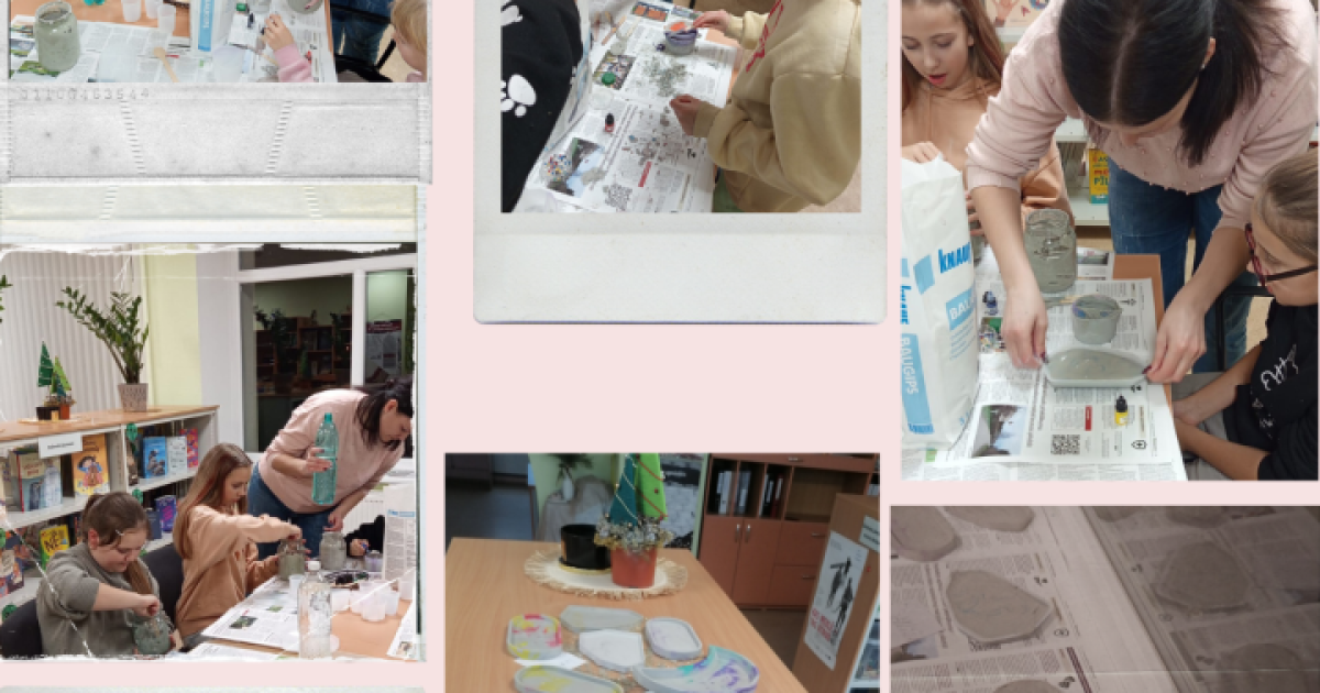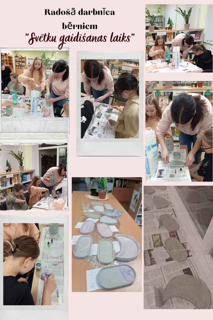 Pirmā radošā darbnīca notika bibliotēkā, kuras laikā tika runāts par to, kas ir Adventa laiks, kādi ir tā simboli un ko tie nozīmē, kā arī par to, kas ir latviešu svinamie svētki. Bērni no ģipša masas lēja trauciņus, kas vēlāk tiks izmantoti kā dekora elementi. Šis process viņiem ļoti patika. Daži pat izveidoja vairākus trauciņus. Bija iespējams ģipša masai pievienot klāt arī krāsu, lai gala rezultāts būtu krāsaināks un interesantāks.