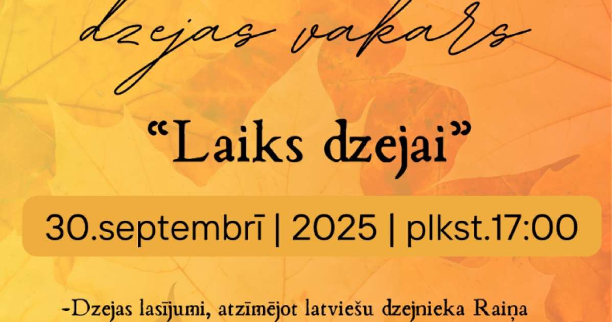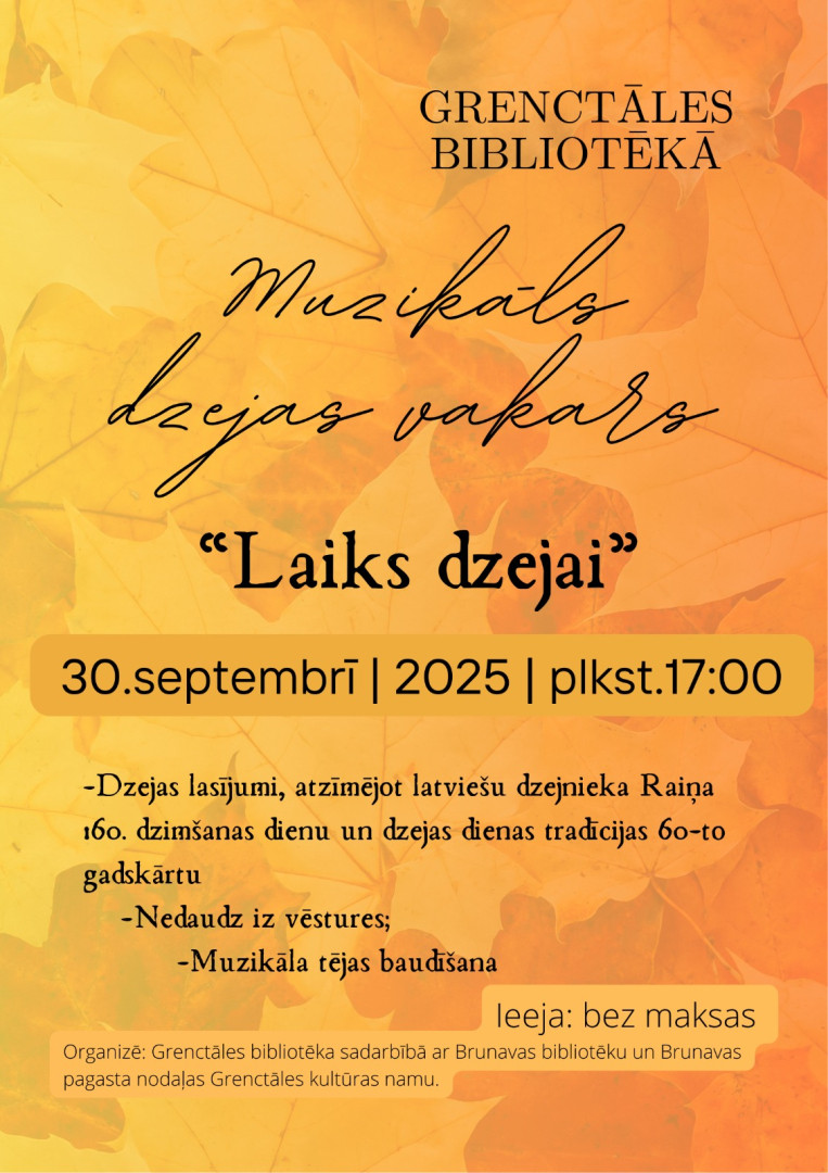 2025. gada 30. septembrī plkst. 17.00 Grenctāles bibliotēkā norisināsies muzikāls dzejas vakars "Laiks dzejai". Pasākumā tiks atzīmēta latviešu dzejnieka Raiņa 160. dzimšanas diena un Dzejas dienas tradīcijas 60. gadskārta.
