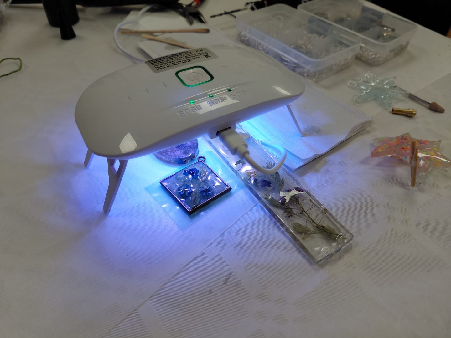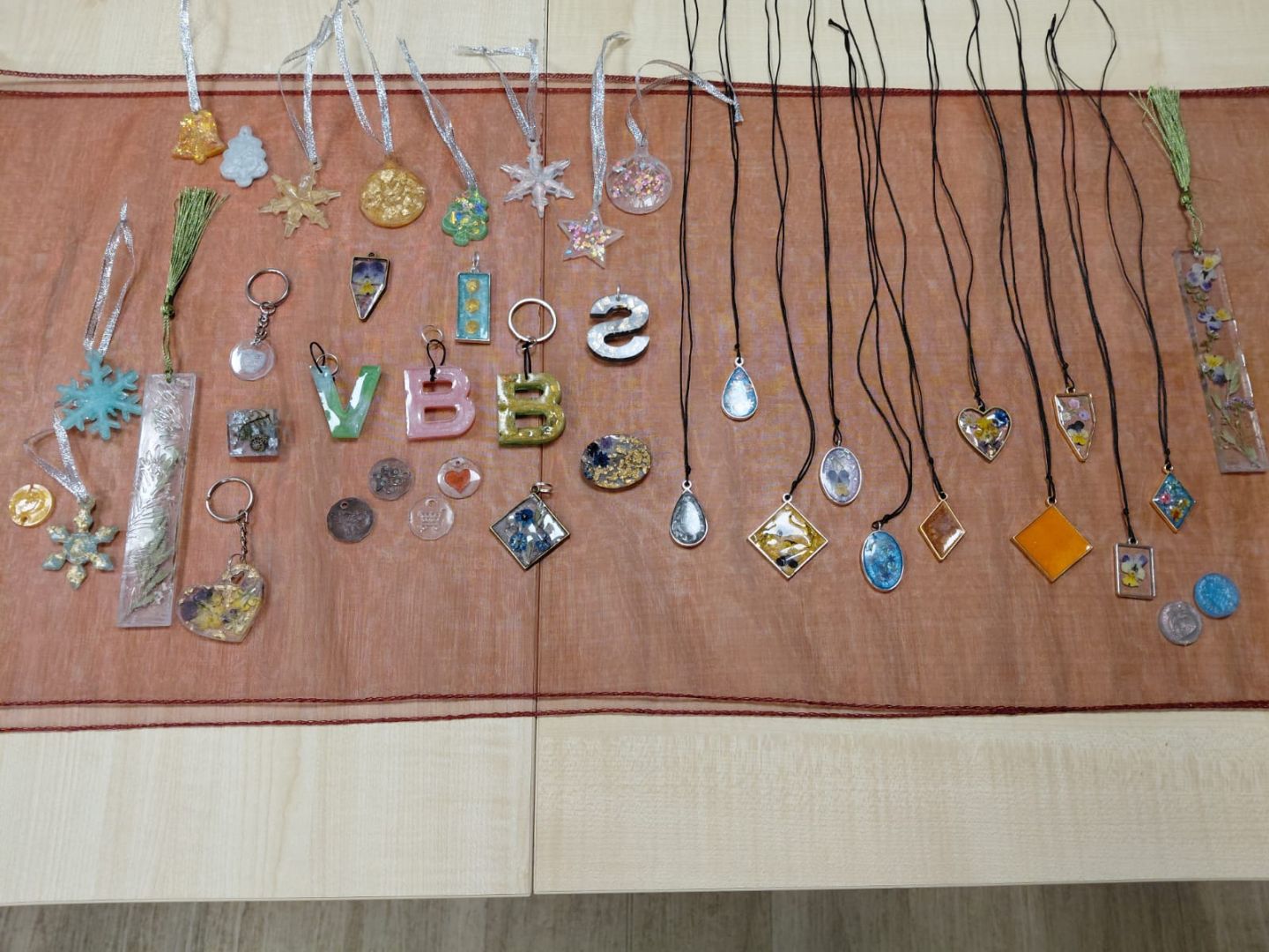 No šķidra, caurspīdīga materiāla tapa eglīšu rotājumi, atslēgu piekariņi, piespraudes, kuloni, grāmatzīmes – katrs priekšmets ar savu krāsu, spīdumu, formu un stāstu. Tika izmantoti gan dabas materiāli un svētku tematikai atbilstoši dekori, gan arī dažādas krāsas, lai darbi būtu ne tikai vizuāli skaisti, bet arī īpaši.