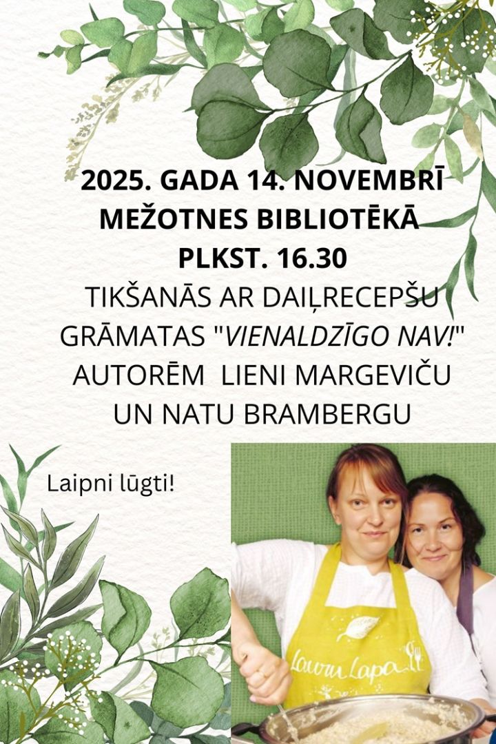 2025. gada 14. novembrī plkst. 16.00 Mežotnes bibliotēkā norisināsies tikšanās ar daiļrecepšu grāmatas "Vienaldzīgo nav!" autorēm Lieni Margeviču un Natu Brambergu.