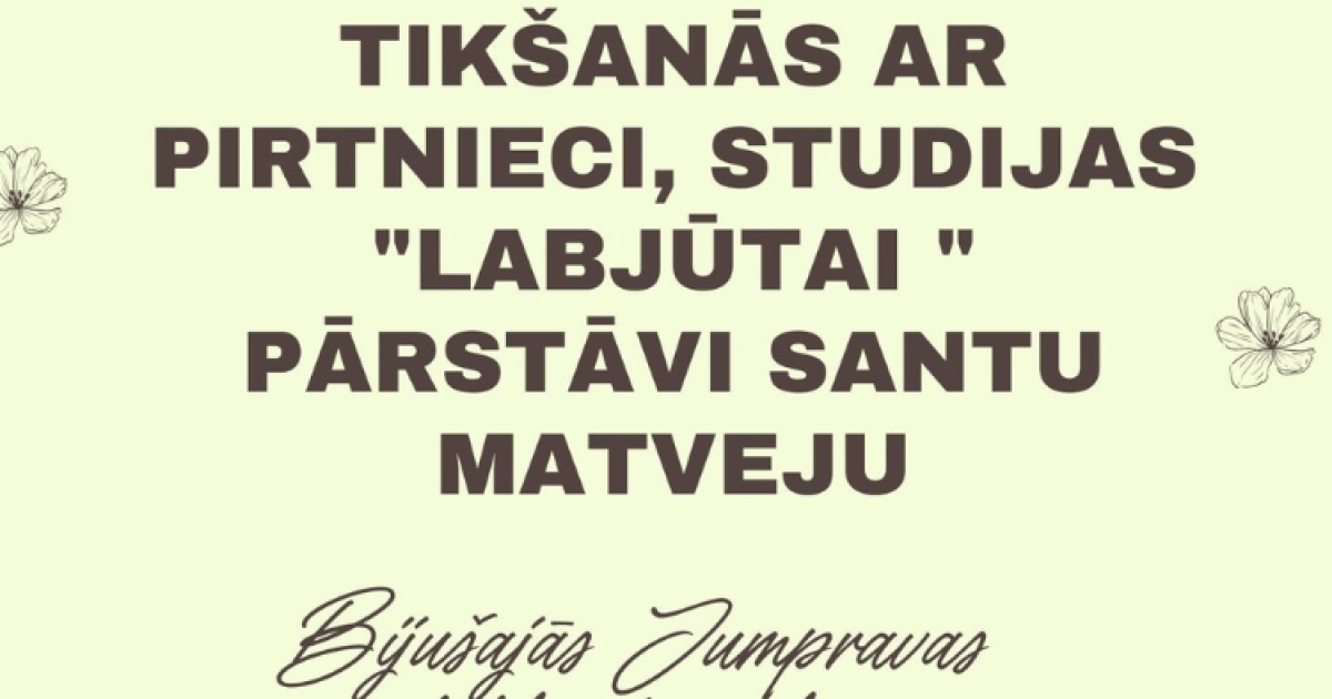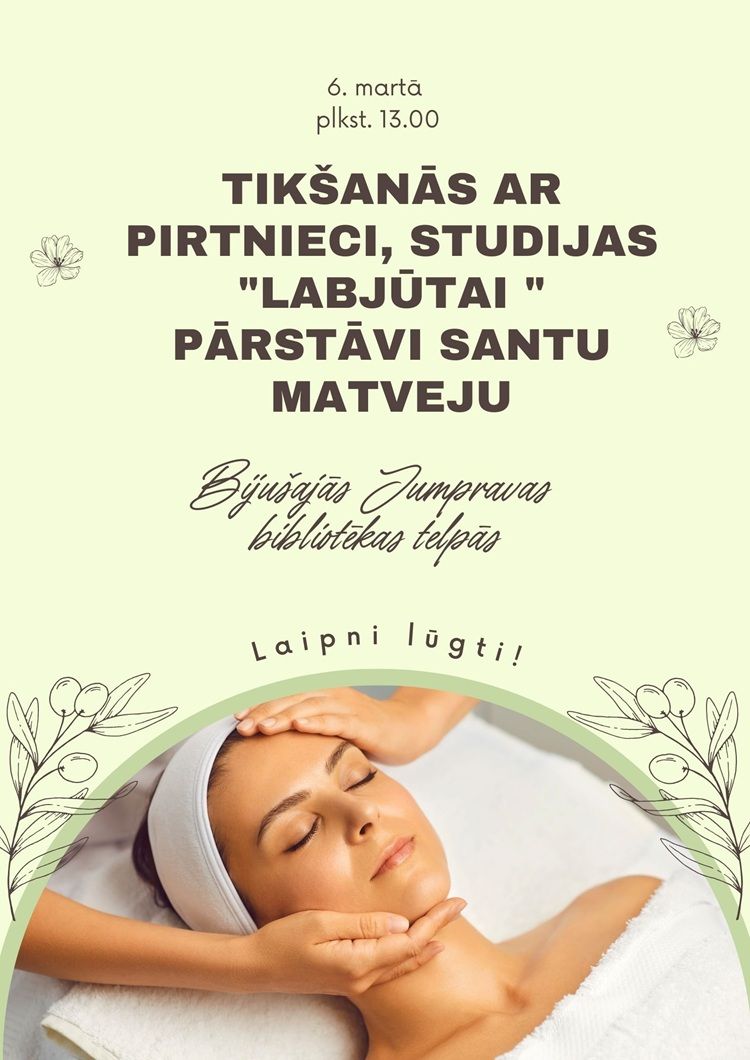 2025. gada 6. martā plkst. 13.00 Mežotnes bibliotēka organizē tikšanos ar pirtnieci, studijas "Labsajūtai" pārstāvi Santu Matveju. Tikšanās norisināsies bijušās Jumpravas bibliotēkas telpās.
