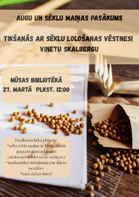 2025. gada 27. martā Mūsas bibliotēkā norisinājās nu jau otrā tikšanās ar sēklu lolotāju Vinetu Skalbergu. Pasākuma mērķis bija ciema čaklos dārza entuziastus pievērst ilgtspējīgākam dārza darbu veikšanas procesam, popularizēt sēklu apmaiņas kustību Mūsas ciemā.