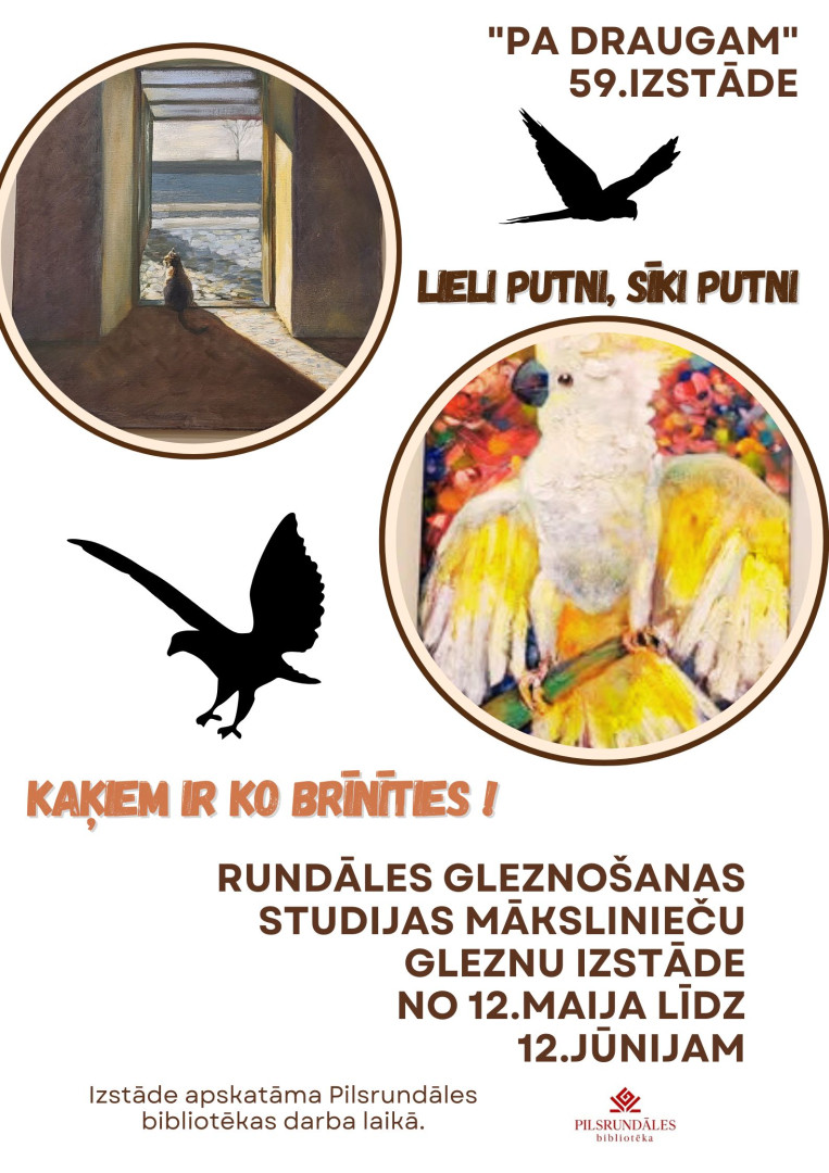 Pilsrundāles bibliotēkā no 2025. gada 12. maija līdz 12. jūnijam (pagarināta līdz vasaras beigām) apskatāma Rundāles multifunkcionālā centra gleznošanas studijas gleznu izstāde "Lieli putni, sīki putni, kaķiem ir ko brīnīties". Tā ir 59. izstāde ciklā "Pa draugam". Nāciet skatīties!