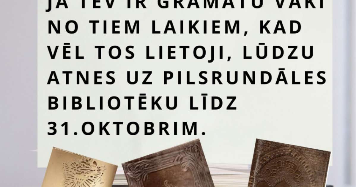 No 2025. gada 20. oktobra līdz 31. oktobrim Pilsrundāles bibliotēka aicina iedzīvotājus piedalīties izstādes "Grāmatu vāki pasargā un izdaiļo" veidošanā. Vairāk par izstādi lasiet šeit!