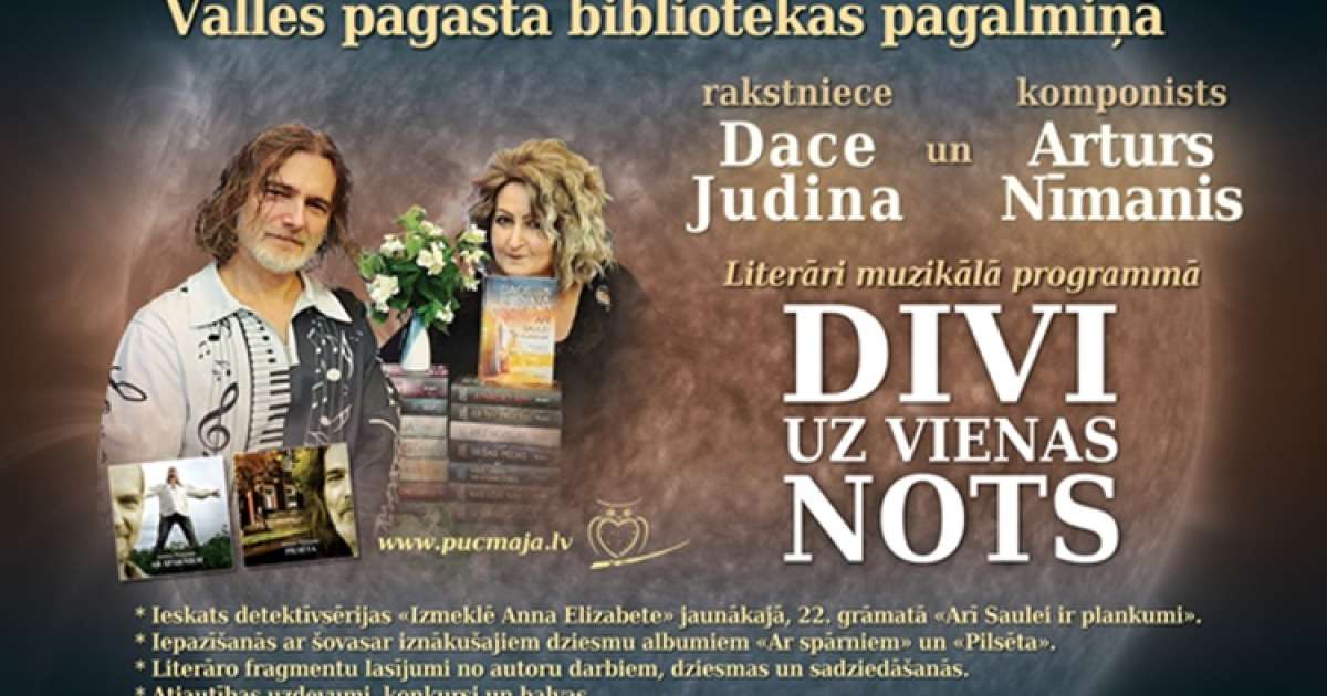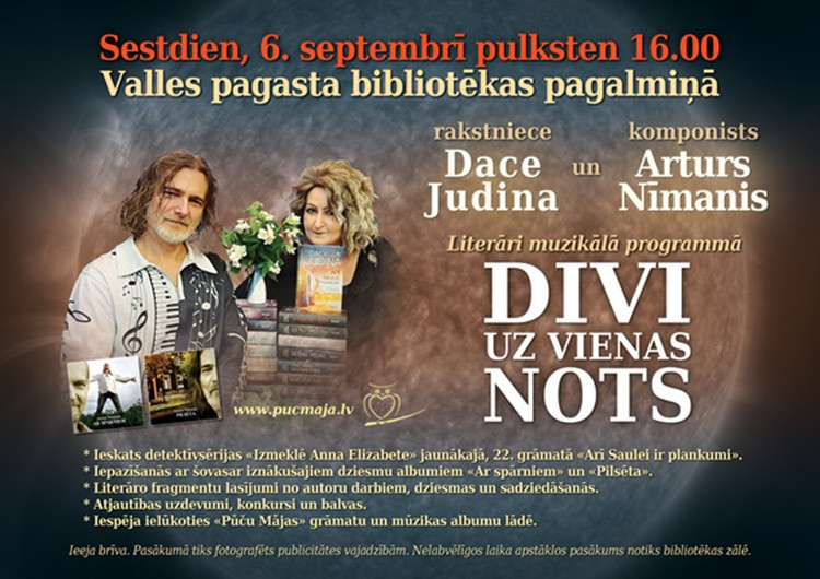 2025. gada 6. septembrī plkst. 16.00 Valles pagasta bibliotēkas pagalmiņā aicināti uz literāri muzikālu programmu "Divi uz vienas nots", kuras ietvaros norisināsies tikšanās ar rakstnieci Daci Judinu un komponistu Arturu Nīmani.