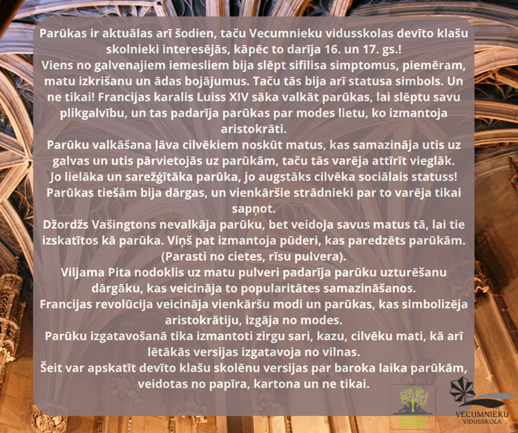 Parūkas ir aktuālas arī šodien, taču Vecumnieku vidusskolas devīto klašu skolnieki interesējās, kāpēc to darīja 16. un 17. gs.! Viens no galvenajiem iemesliem bija slēpt sifilisa simptomus, piemēram, matu izkrišanu un ādas bojājumus. Taču tās bija arī statusa simbols. Un ne tikai! Francijas karalis Luiss XIV sāka valkāt parūkas, lai slēptu savu plikgalvību, un tas padarīja parūkas par modes lietu, ko izmantoja aristokrāti.