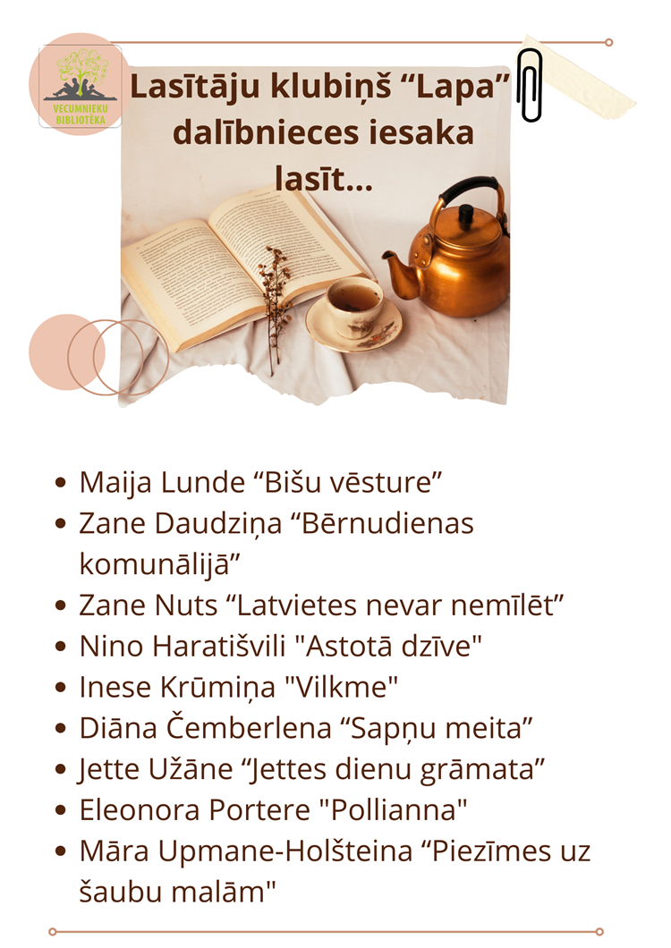 2026. gada 10. janvārī Vecumnieku pagasta bibliotēkā aizritējusi lasītāju klubiņa "Lapa" kārtējā tikšanas reize. Tikšanās laikā katra klubiņa dalībniece izteicās par pēdējo izlasīto grāmatu - jaunumu, ko saņēma decembra tikšanās reizē, ietītu kā dāvanu necaurspīdīgā papīrā. Dalībnieces gada laikā viena otru ir tik labi iepazinušas, ka izteica minējumu, kurai šī grāmata būtu vairāk piemērotāka, kā arī deva par grāmatu vērtējumu piecu punktu sistēmā.  Tika diskutēts arī par novērotajām lasīšanas tendencēm un secināts, ka sabiedrība mainās, un tai ir jāspēj piemēroties! Sarunas raitāk raisījās tad, kad kādu konkrētu darbu bija izlasījušas vismaz divas dalībnieces, tāpēc turpmāk tika pieņemts lēmums turpināt šādā formātā.