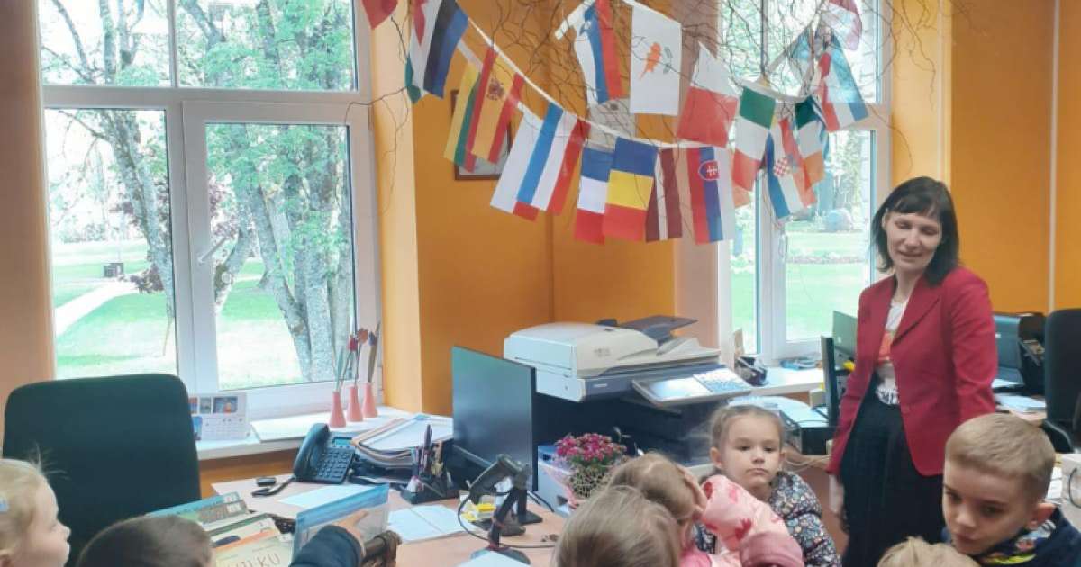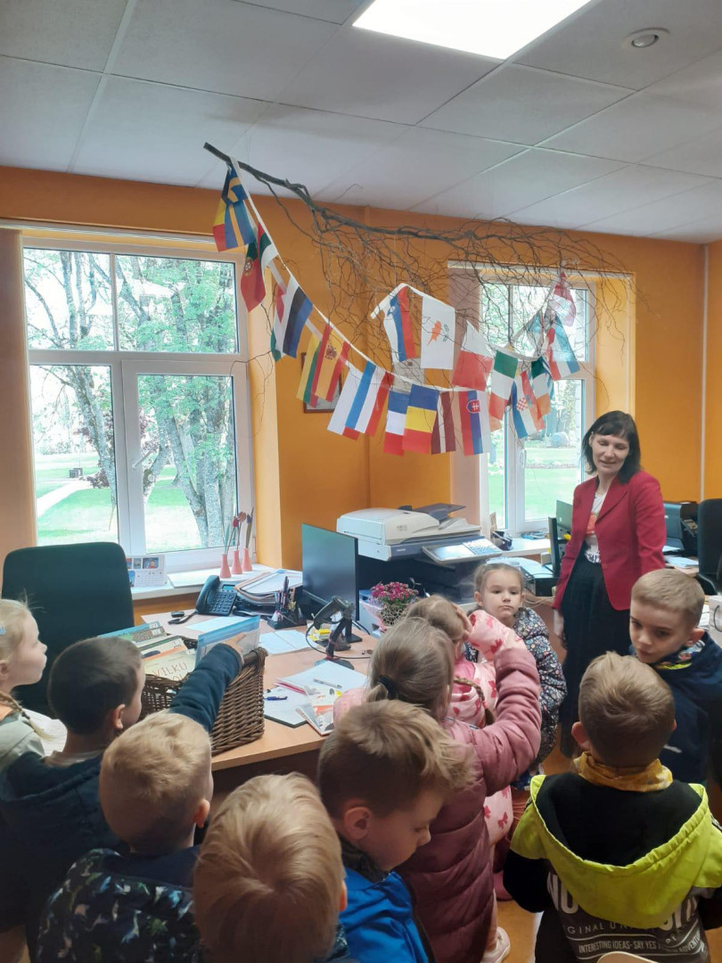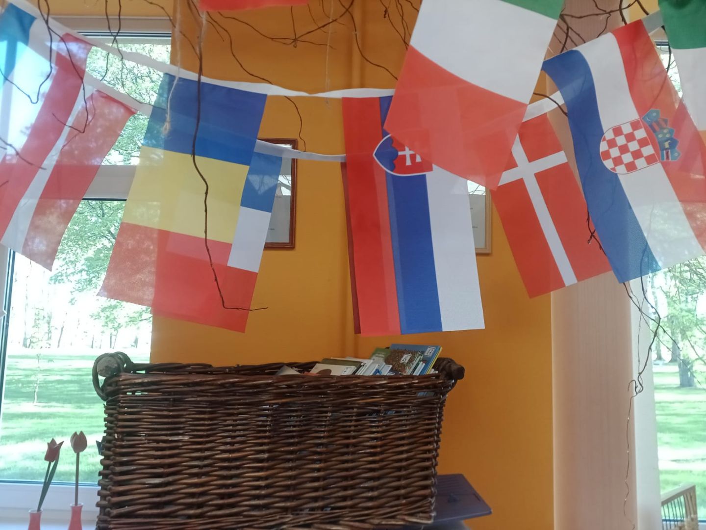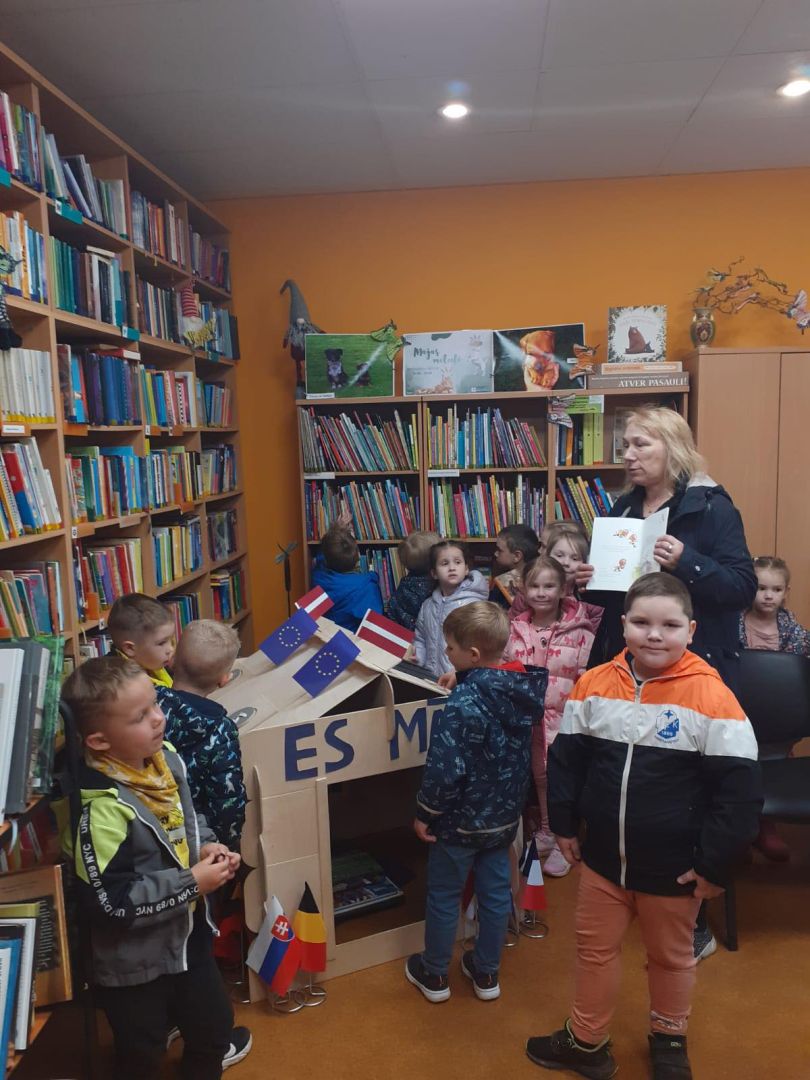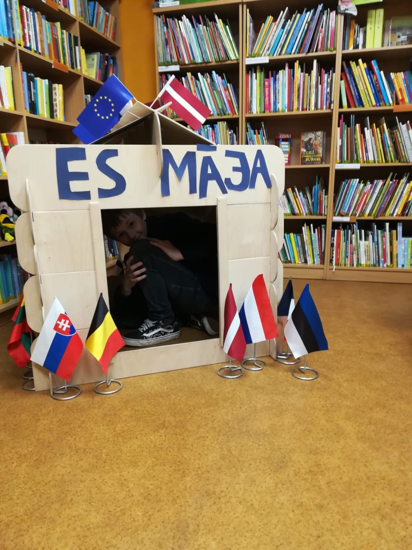 Eiropas dalībvalstu karodziņi redzami bibliotēkas telpās it visur! Uzdevums pieaugušajiem – tos atpazīt un atbildēt uz bērnu jautājumiem, kurai valstij tas pieder.