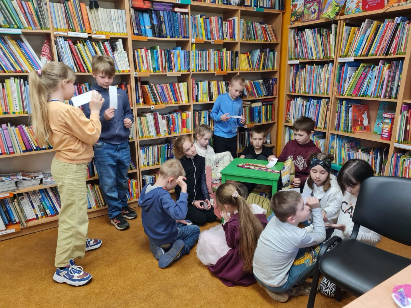 Interesi par tēmām izrādīja Vecumnieku vidusskolas 1.a, 2.b, 3.b. klase. Rīta pusē skolotāja Anita Čerpinska ar 2.b un Aija Staškeviča ar 1.a klašu zinātkārajiem skolēniem uzzināja, kas ir bibliotēka un ko tur var darīt, un kā var kļūt par bibliotēkas lietotāju. Bērniem tika izstāstīts, kā grāmatas nonāk bibliotēkā un kā tās tiek izvietotas plauktos. Prieks, ka skolēniem bija daudz jautājumi, tādi kā - kas dod naudu grāmatu iegādei, cik tās kopā ir plauktos un ko darīt, kad tās visas tiek atdotas lasītājiem. Apmeklējuma noslēgumā bija dots uzdevums atrast un bibliotekārei nosaukt grāmatu nosaukumu, pie kura paslēpies grāmatu tārpiņš, iegūt attiecīgo burtu un kopīgi ar klases biedriem izveidot vārdu "LASĪTPRIEKS", no grāmatu nosaukumiem izveidojās īpašs dzejolis.