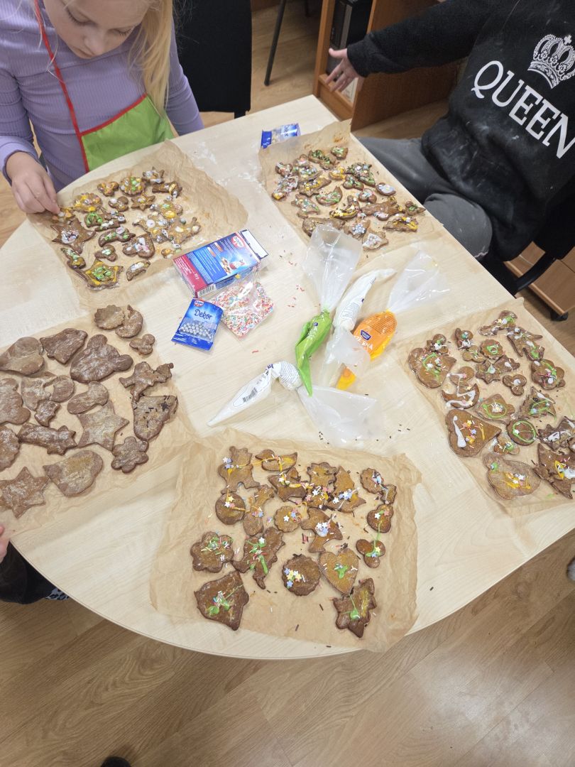 Darbnīcas laikā bērni paši izrullēja mīklu, izmantojot formiņas veidoja piparkūkas un vēroja cepšanas procesu. Kad piparkūkas bija gatavas, varēja ķerties klāt pie rotāšanas. Gala rezultātā mums sanāca ļoti garšīgas piparkūkas. Kopā mums izdevās radīt Ziemassvētku noskaņu bibliotēkā.