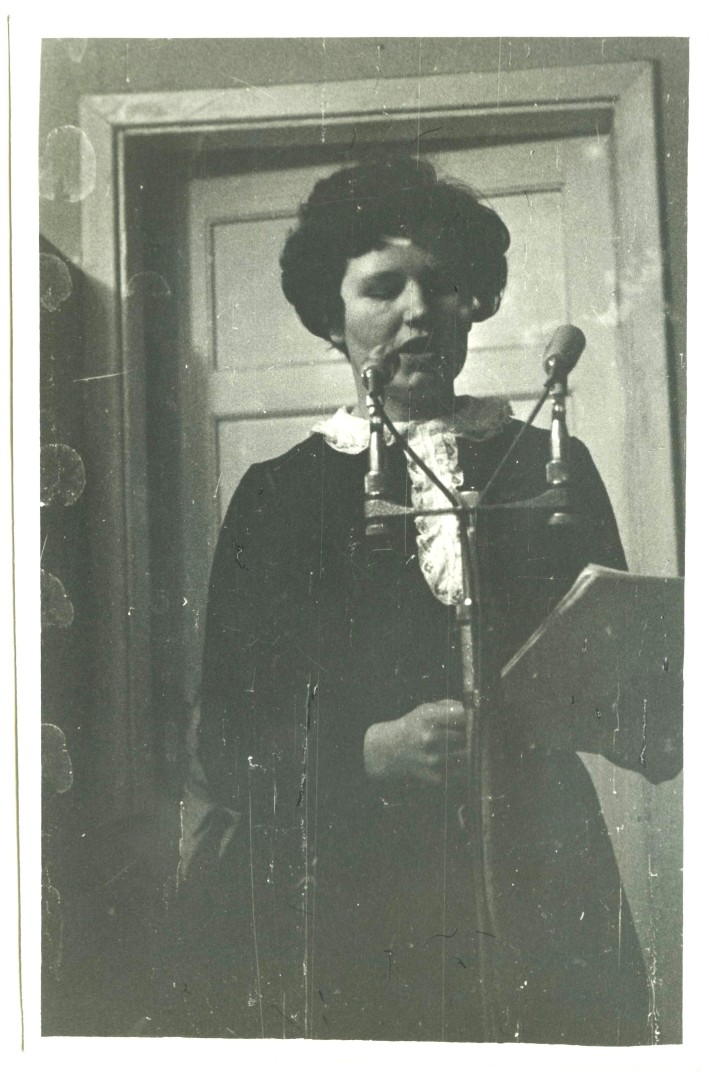 Aina Medne lasa dzeju Bauskas rajona bibliotēkā. Tikšanās ar jaunajiem dzejniekiem - K. Skujenieku, A. Ločmeli, R. Saulāju 1970. gada 28. janvārī.