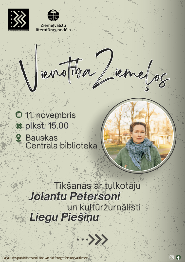 Ziemeļvalstu literatūras nedēļas ietvaros, kas šogad tiek atzīmēta laikaposmā no 10. līdz 16. novembris, Bauskas Centrālajā bibliotēkā norisināsies pasākums "Vienotība Ziemeļos". 11. novembrī plkst. 15.00 ar lasītājiem tiksies tulkotāja Jolanta Pētersone, lai sarunā ar kultūržurnālisti Liegu Piešiņu atklātu savu Ziemeļu stāstu par kopības sajūtu, lojalitāti un piederību.